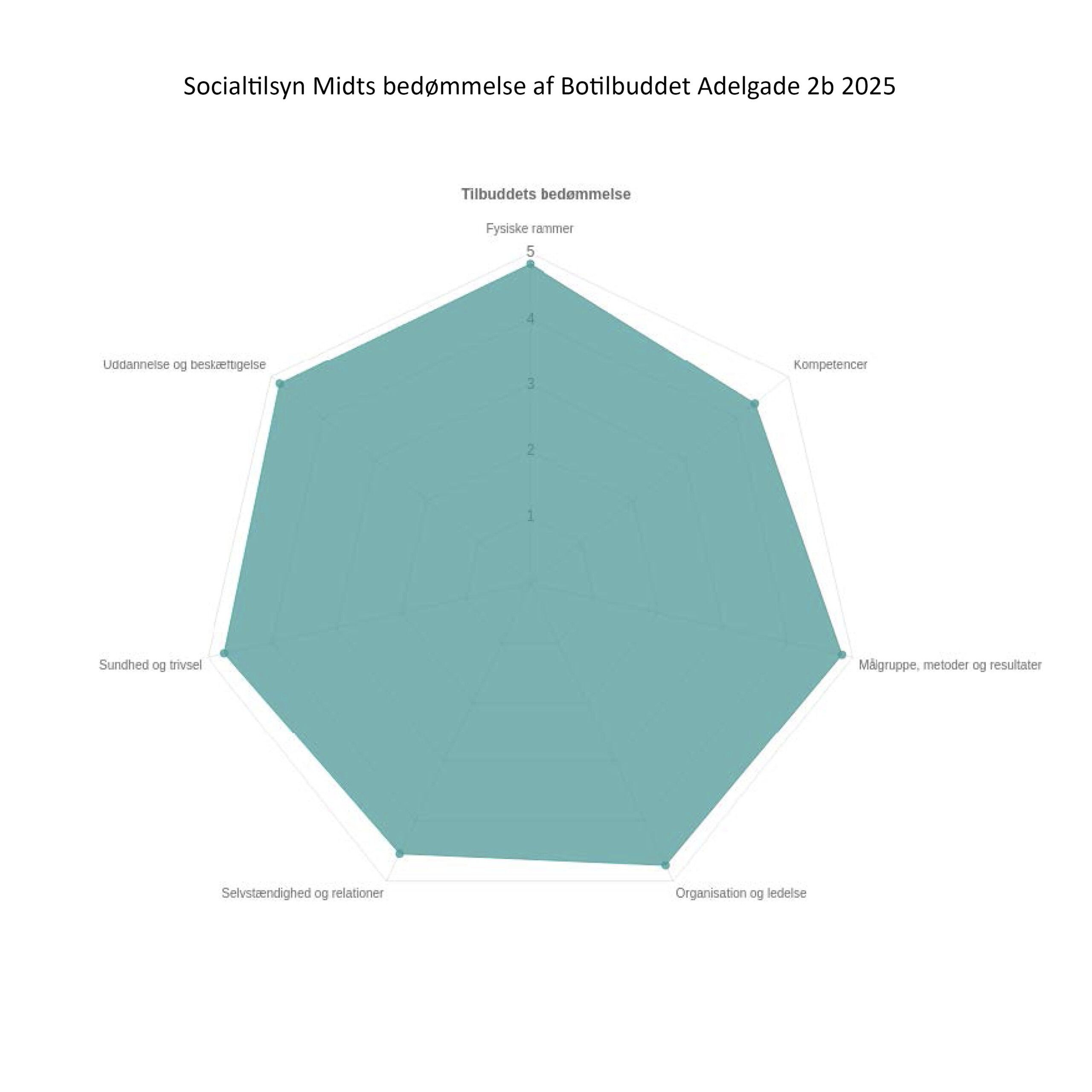 “Socialtilsyn Midt vurderer ud fra temaet sundhed og trivsel, at Botilbuddet Adelgade har fokus på at understøtte borgernes trivsel, sundhed, medinddragelse og indflydelse på eget liv. Tilbuddet har et konstruktivt samarbejde med eksterne samarbejdspartnere, som eksempelvis psykiatrien. Det vurderes, at medarbejderne har en respektfuld og dialogbaseret tilgang til borgerne og praktiserer en individuel afstemt, genkendelig og anerkendende indsats, der blandt andet forebygger vold, overgreb og magtanvendelser.”