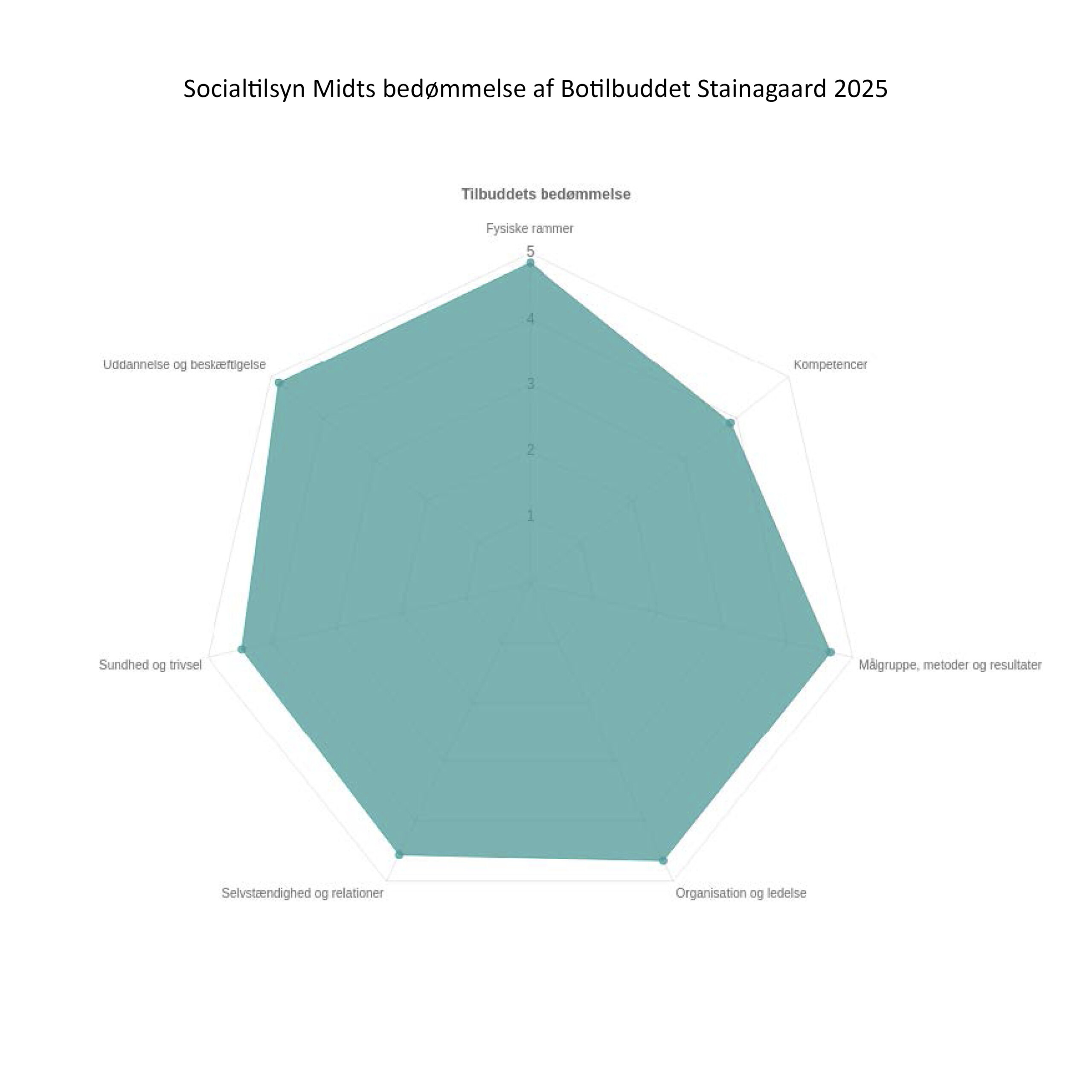 “Det er Socialtilsyn Midts vurdering, at Stainagaard understøtter borgernes fysiske og mentale sundhed og trivsel. I vurderingen er der lagt vægt på, at tilbuddet understøtter borgernes selv- og medbestemmelse og at tilbuddet har respekt for den enkelte borgeres mening og integritet. Borgernes trivsel er god.